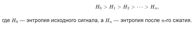 Информационная энтропия сигнала снижается - это математически точный механизм. Утверждение о том, что информационная энтропия сигнала снижается при lossy-сжатии, математически корректно. Это следует из определения энтропии Шеннона и принципов работы алгоритмов сжатия с потерями.
