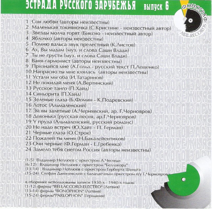 Сборник: Эстрада русского зарубежья Выпуск 6 - Замело тебя снегом, Россия Год выпуска: 1997 Жанр: Шансон Формат: WAV Качество: Lossless Размер архива: 632 мб Содержание: 1. Владимир Неплюев-Сон любви. (авторы неизвестны) (3:15) 2. Владимир Неплюев-Маленькая токияночка. (С. Кристине - неизвестный автор) (2:17) 3. Владимир Неплюев-Звезды молча горят. (Биксио - неизвестный автор) (2:41) 4. Владимир Неплюев-Яблочко. (авторы неизвестны) (2:22) 5. Владимир Неплюев-Помню вальса звук прелестный. (К. Листов) (2:26) 6. Владимир Неплюев-Ах, вы мадам. (муз. и сл. Саши Влади) (2:50) 7. Владимир Неплюев-Ты не грусти. (муз. и сл. Саши Влади) (3:12) 8. Владимир Неплюев-Ваня-гармонист. (авторы неизвестны) (2:44) 9. Владимир Неплюев-Признайся мне. (А. Гольд - русский текст П. Лещенко) (3:27) 10. Владимир Неплюев-Напрасно ты мне клялась. (авторы неизвестны) (2:51) 11. Владимир Неплюев-Устали оба мы. (И. Татаринов) (2:54) 12. Владимир Неплюев-Не покидай меня. (А. Вертинский) (2:44) 13. Владимир Неплюев-Русское танго. (П. Хайд) (3:08) 14. Владимир Неплюев-Сеньорита. (П. Хайд) (2:45) 15. Стефан Данилевский-Зеленые глаза. (Б. Фомин - К. Подревский.) (2:52) 16. Стефан Данилевский-Лотос. (Альмаленский) (3:04) 17. Стефан Данилевский-Эй вы залетные. (А. Чернявский, арр. Г. Чернояров) (2:56) 18. Стефан Данилевский-Девонька. (арр. Г. Черноярова, русская песня) (2:44) 19. Стефан Данилевский-У пруда. (Альмаленский, русский романс) (2:40) 20. Стефан Данилевский-Не надо встреч. (Ю. Хайт - П. Герман) (3:09) 21. Стефан Данилевский-Черные глаза. (О. Строк) (3:06) 22. Стефан Данилевский-Пожалей ты меня. (Н. Бакалейентиков) (2:49) 23. Стефан Данилевский-Очи черные. (Ф. Герман - Е. Гребенка) (2:50) 24. Стефан Данилевский-Замело тебя снегом Россия. (авторы неизвестны) (3:00) https://i.postimg.cc/GpL5bYQq/сканирование0007.jpg https://i.postimg.cc/2SftXgBp/сканирование0006.jpg https://i.postimg.cc/8CZMVVF7/сканирование0008.jpg https://wdfiles.ru/3uD3f |