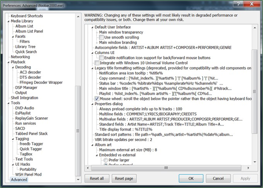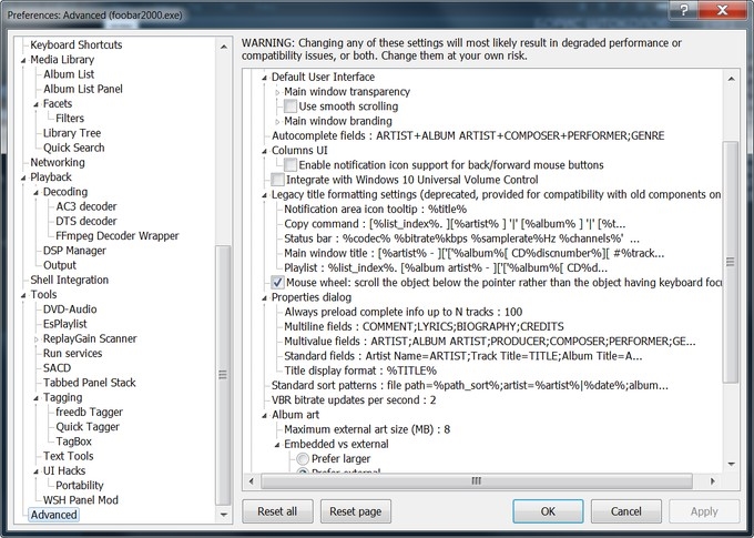 - В foobar2000 откройте настройки: File → Preferences → Advanced → Display → Legacy title formatting settings → Copy command.
