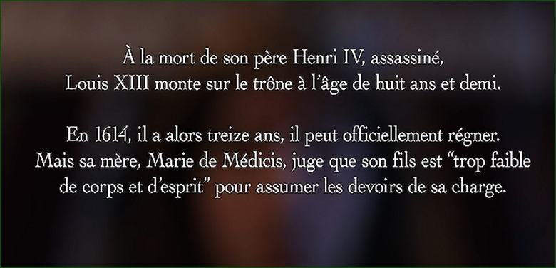 После убийства его отца Генриха IV (Henri IV) 14 мая 1610 года 9-летний Людовик XIII (род. 27 сентября 1601) стал королём Франции под регентством своей матери Марии Медичи (Marie de Médicis).